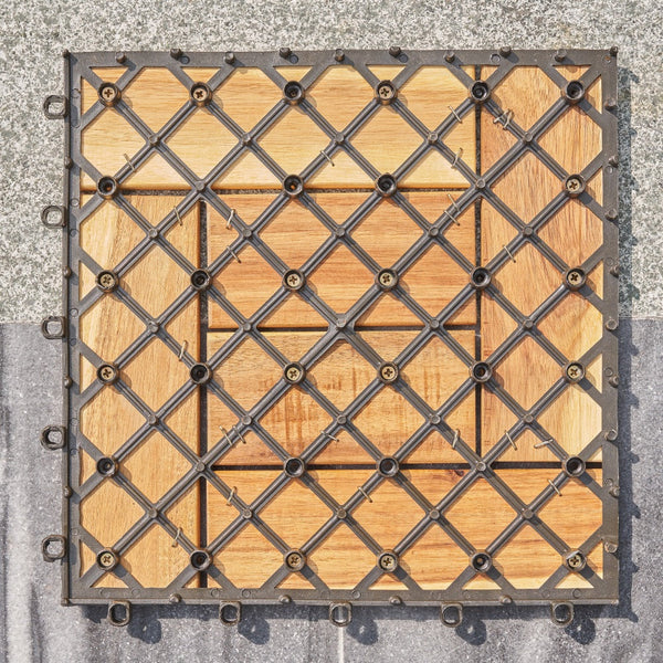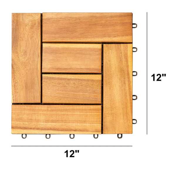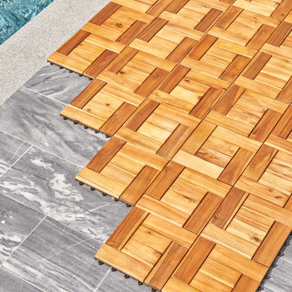 Enhance your outdoor and indoor spaces effortlessly with our Acacia Wood Deck Tiles. Featuring 6 puzzle slats per tile, these tiles are a stylish and practical solution for patios, decks, balconies, porches, walkways, pools, hot tub areas, as well as garage, basement, and bathroom floors.