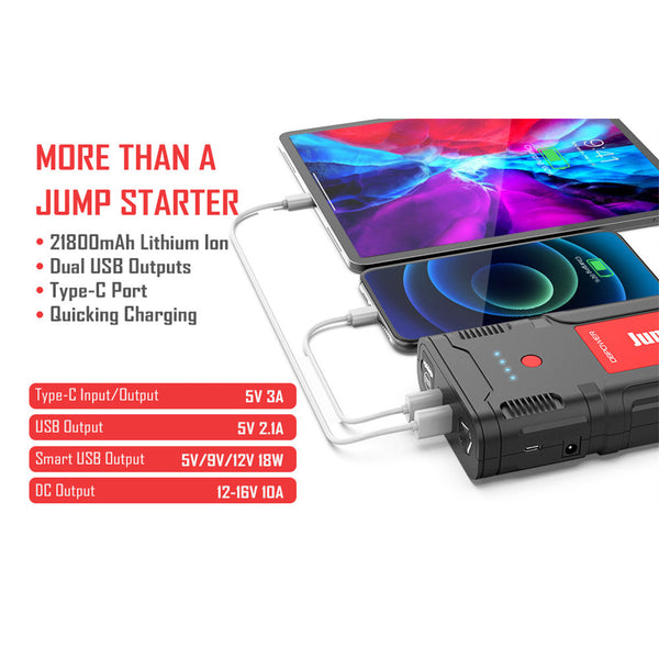 - Start 10.0L gasoline and 8.0L diesel engines in seconds, with heavy-duty clamps for up to 50 jump starts on a single charge.