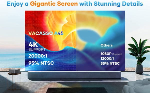 Elevate your home entertainment with the VACASSO Electric Focus Projector, boasting native 1080P resolution and 4K support for stunning visuals. With touch screen buttons and electronic focus adjustment, achieving precise image clarity is effortless.