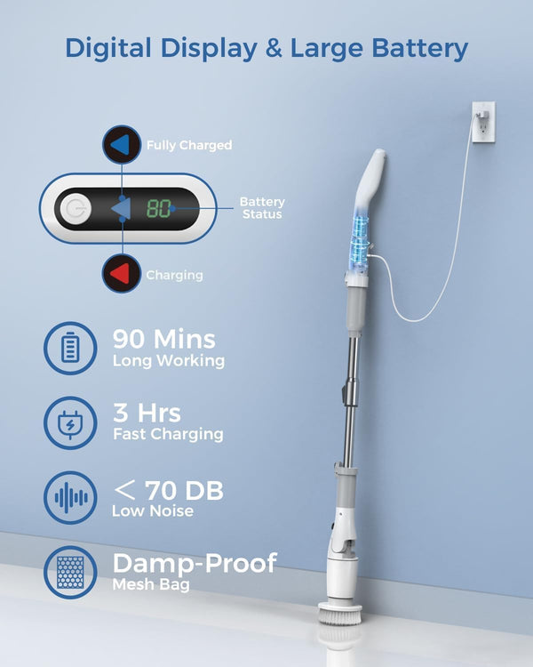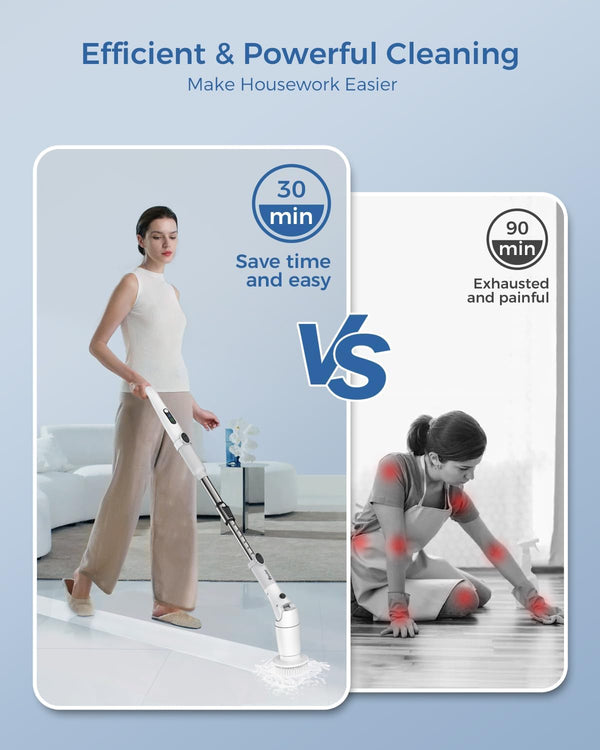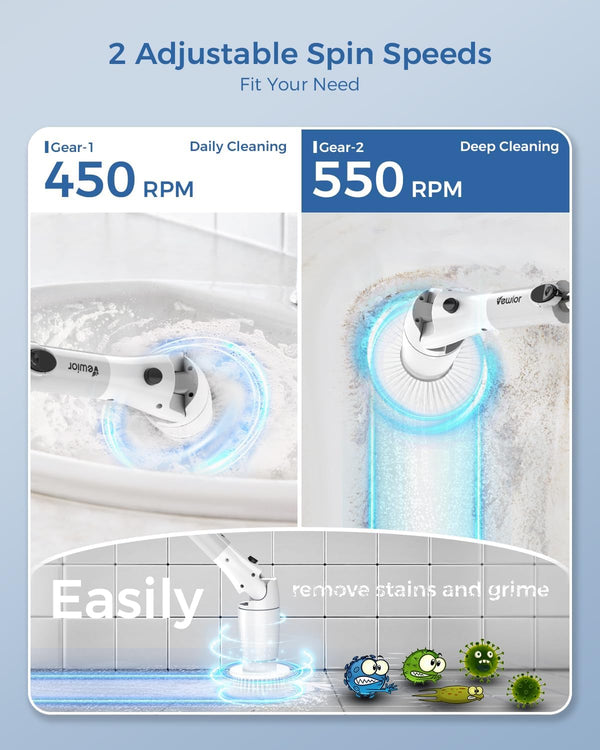Featuring two adjustable spin speeds (450/550RPM) and a powerful motor, the VEWIOR spin scrubber handles daily and deep cleaning on different surfaces effortlessly. The intelligent digital display shows battery power and spin speeds, ensuring a hassle-free cleaning experience and reducing cleaning time from 2 hours to just 20 minutes.